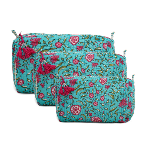 Keep your essentials beautifully organized with our hand block-printed vanity pouches, available in a thoughtfully designed set of three sizes: small, medium, and large.
